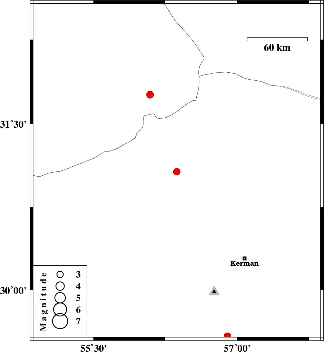 | 2009/10/07 | 13:04:55.4 | 16:34:55.4 | 29.58 | 56.9 | 18 | ML:3.2 | Kerman Province, 48 km North-East of Baft |