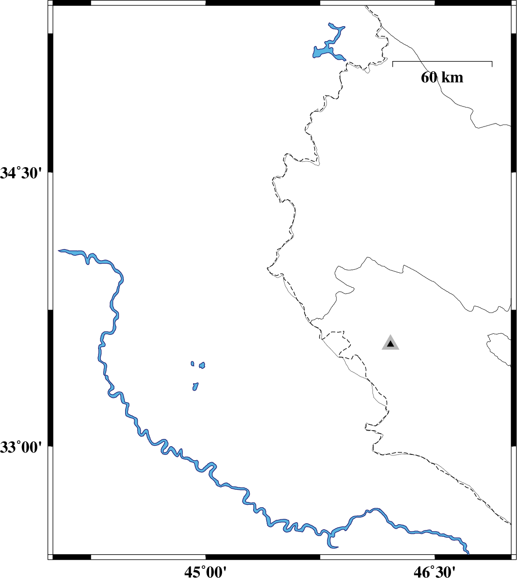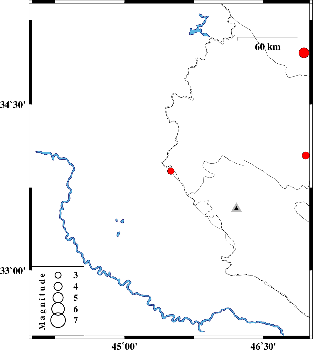 | 2009/10/14 | 03:22:11.7 | 06:52:11.7 | 33.9 | 45.5 | 15 | ML:3.2 | Iraq, 47 km South-West of Gilan-E-Gharb | ||