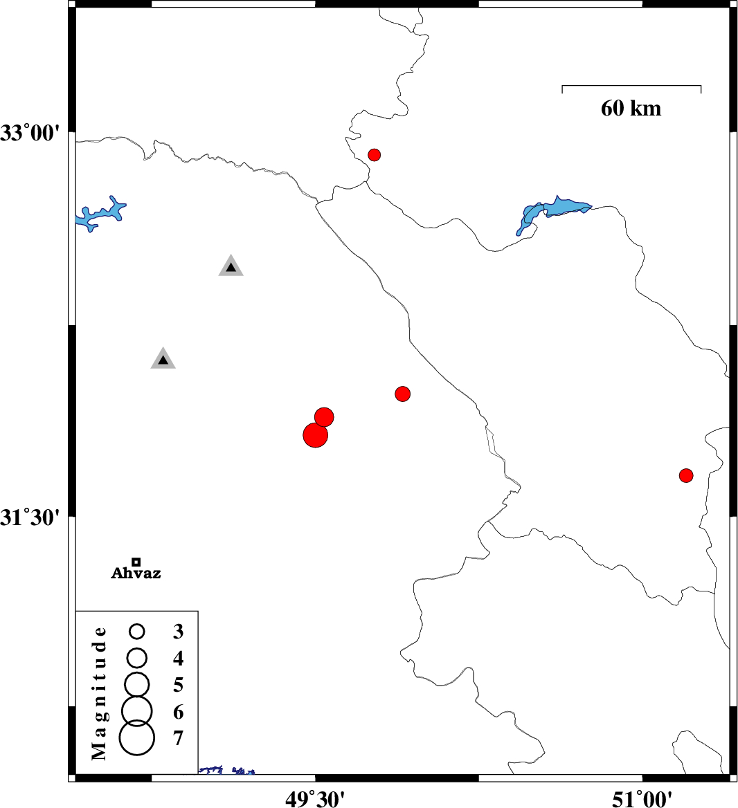 | 2009/10/04 | 21:50:49.6 | 01:20:49.6 | 31.82 | 49.5 | 15 | ML:5.1 | Khoozestan Province, 22 km South-East of Masjed Soleyman | ||