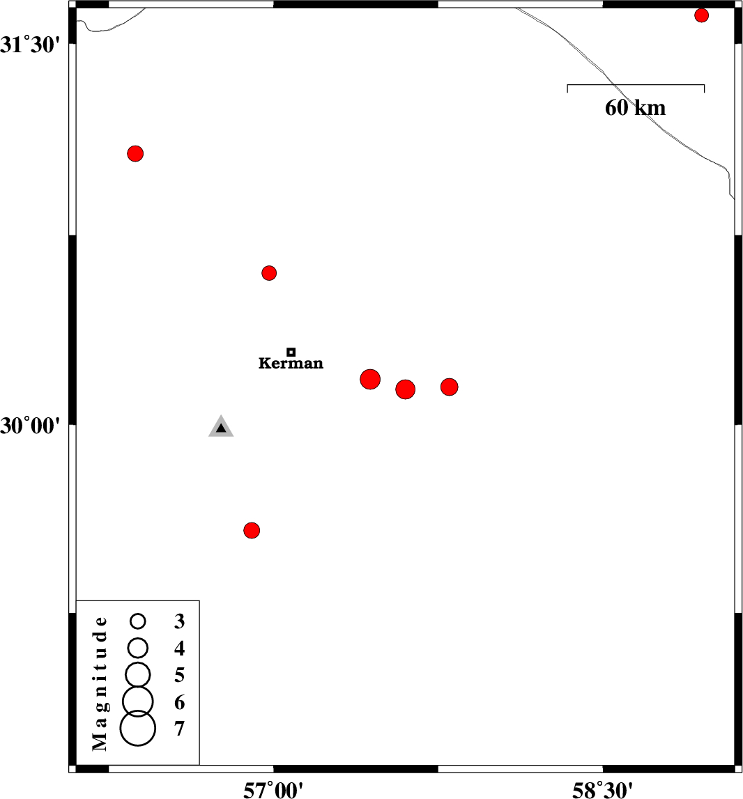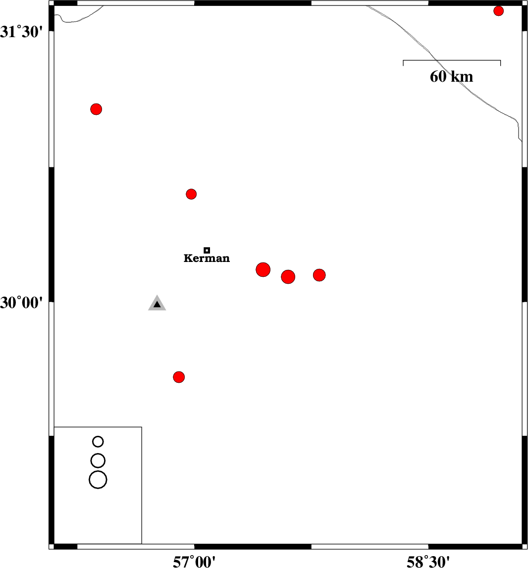 | 2009/10/17 | 17:08:08.8 | 20:38:08.8 | 30.18 | 57.44 | 12 | ML:4.1 | Kerman Province, 36 km South-East of Kerman | ||