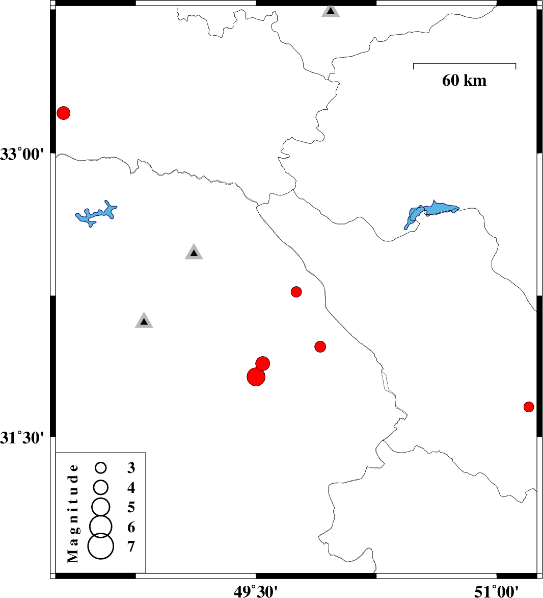 | 2009/10/04 | 21:50:49.6 | 01:20:49.6 | 31.82 | 49.5 | 15 | ML:5.1 | Khoozestan Province, 22 km South-East of Masjed Soleyman | ||