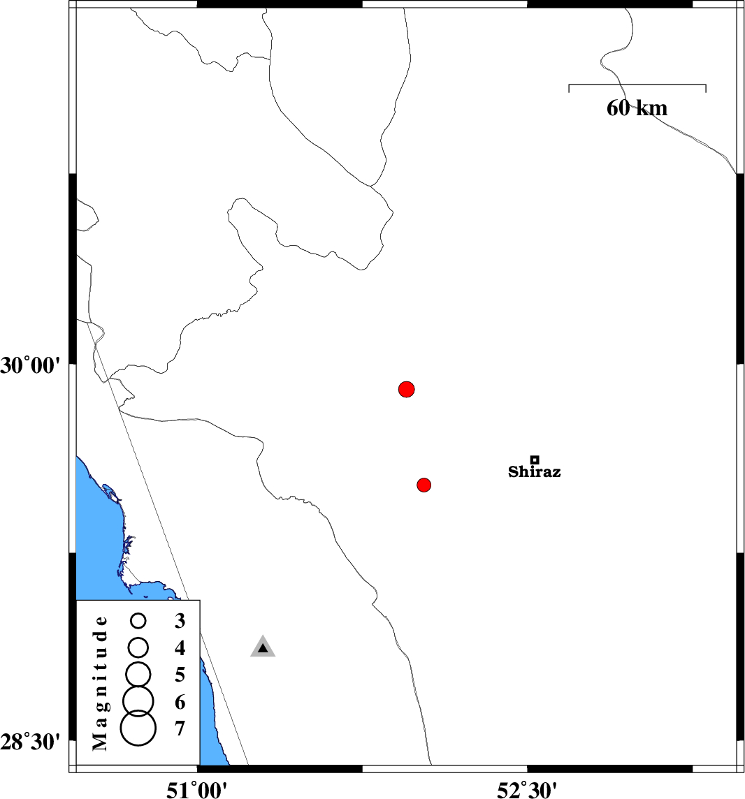 | 2009/10/22 | 17:04:25.2 | 20:34:25.2 | 29.52 | 52.03 | 15 | ML:2.8 | Fars Province, 38 km East of Kazerun |