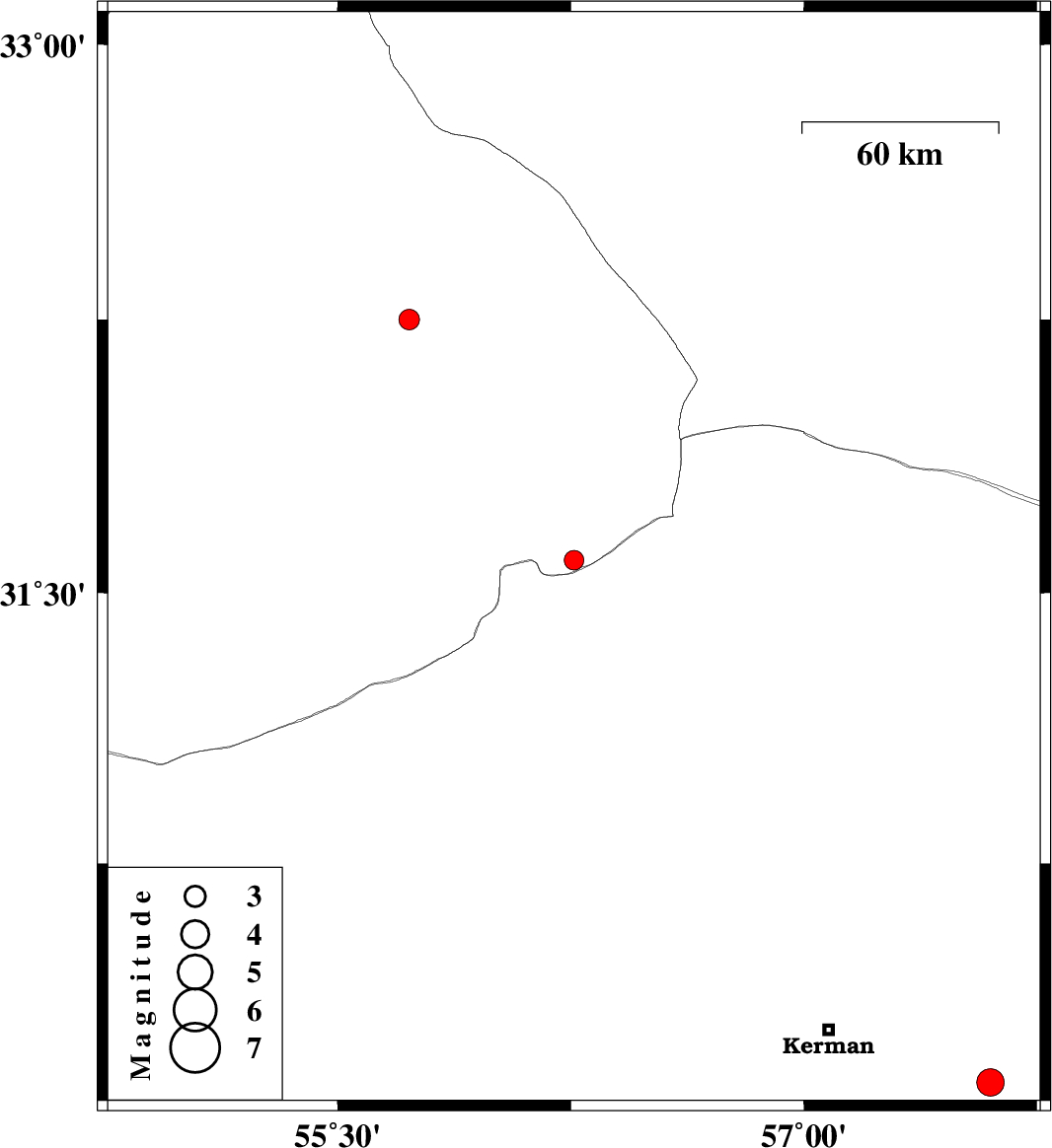 | 2009/10/21 | 01:44:37.5 | 05:14:37.5 | 30.14 | 57.6 | 15 | ML:3.9 | Kerman Province, 53 km South-East of Kerman |