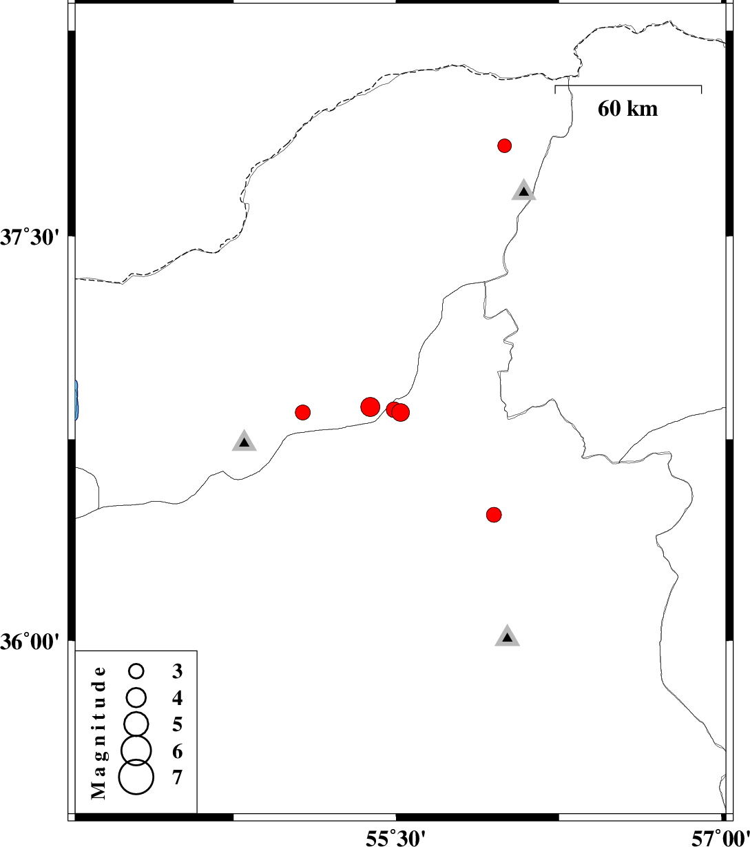 | 2009/09/29 | 06:32:04.5 | 10:02:04.5 | 36.87 | 55.38 | 14 | ML:4 | Golestan Province, 40 km South of Minodasht | ||