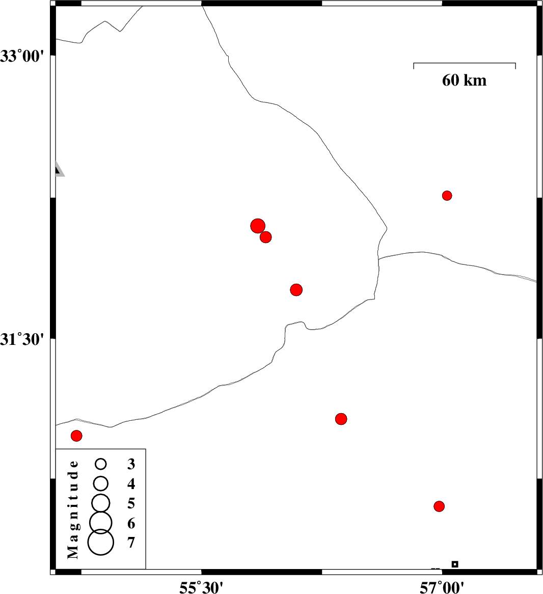 | 2009/09/30 | 00:12:01.1 | 03:42:01.1 | 32.04 | 55.9 | 15 | ML:3.3 | Yazd Province, 68 km North-East of Bafq | ||