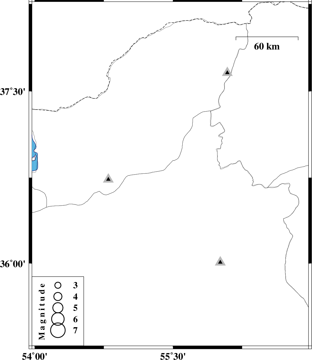 | 2009/10/19 | 22:04:45.0 | 01:34:45.0 | 36.77 | 55.47 | 14 | ML:2.6 | Semnan Province, 52 km South of Minodasht |