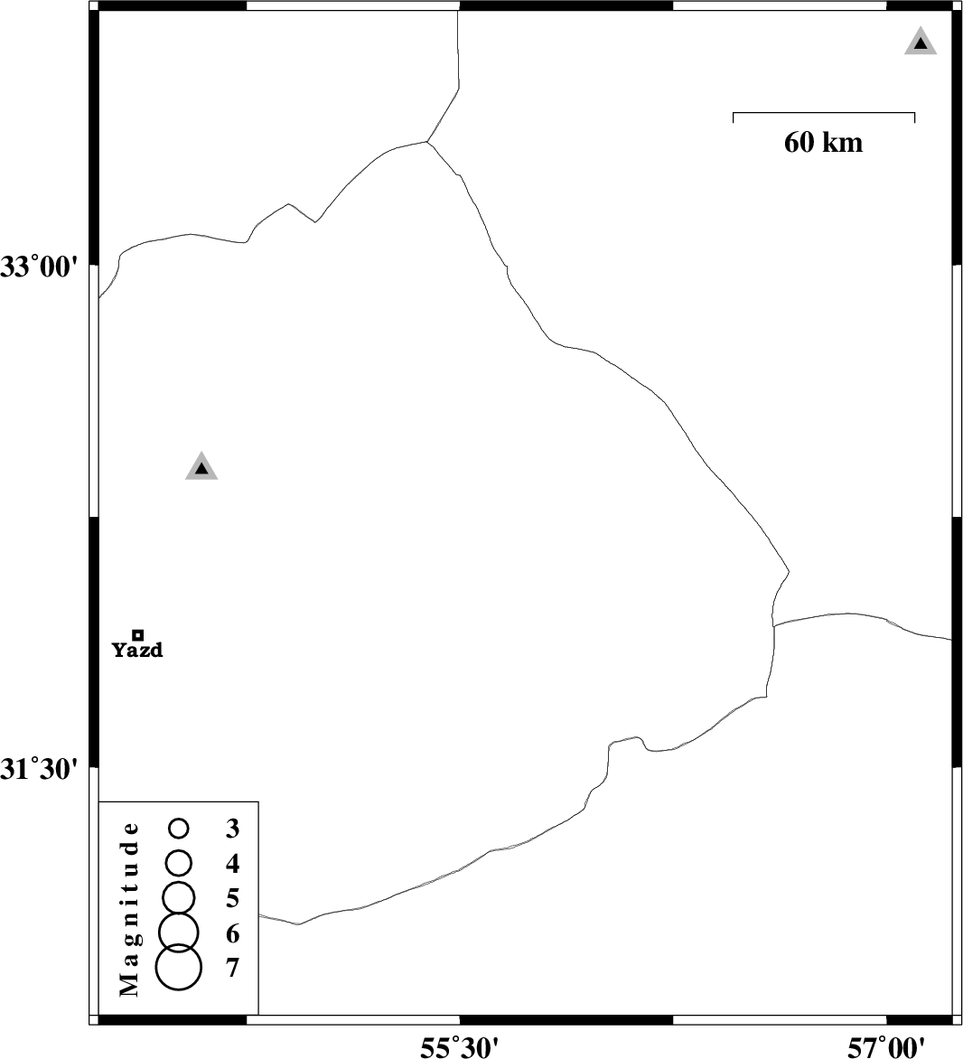 | 2009/10/22 | 16:50:42.6 | 20:20:42.6 | 32.25 | 55.73 | 15 | ML:2.9 | Yazd Province, 78 km North-East of Bafq |
