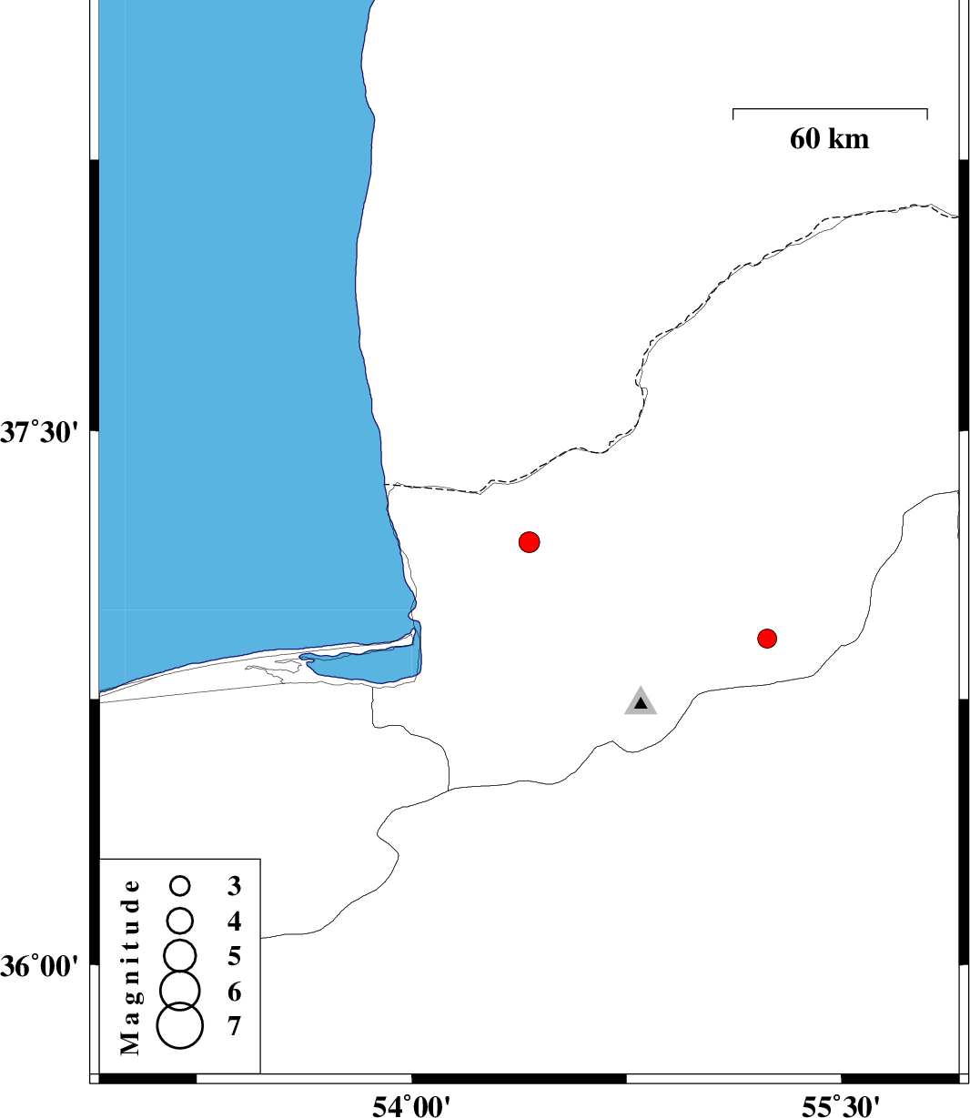| 2009/10/29 | 11:32:10.9 | 15:02:10.9 | 37.19 | 54.41 | 18 | ML:3.3 | Golestan Province, 20 km North of Aq Qaleh |