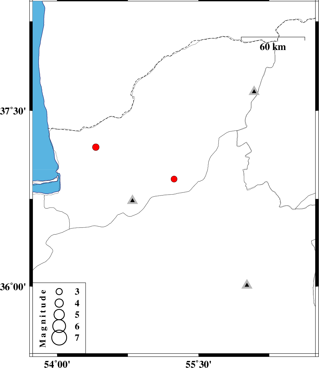 | 2009/10/29 | 11:32:10.9 | 15:02:10.9 | 37.19 | 54.41 | 18 | ML:3.3 | Golestan Province, 20 km North of Aq Qaleh |