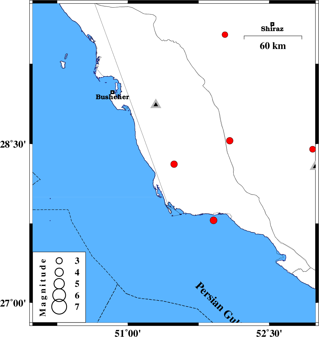 | 2009/10/09 | 19:14:42.1 | 22:44:42.1 | 27.78 | 51.91 | 15 | ML:3.4 | Persian Gulf, 16 km West of Bandar-e kangan |