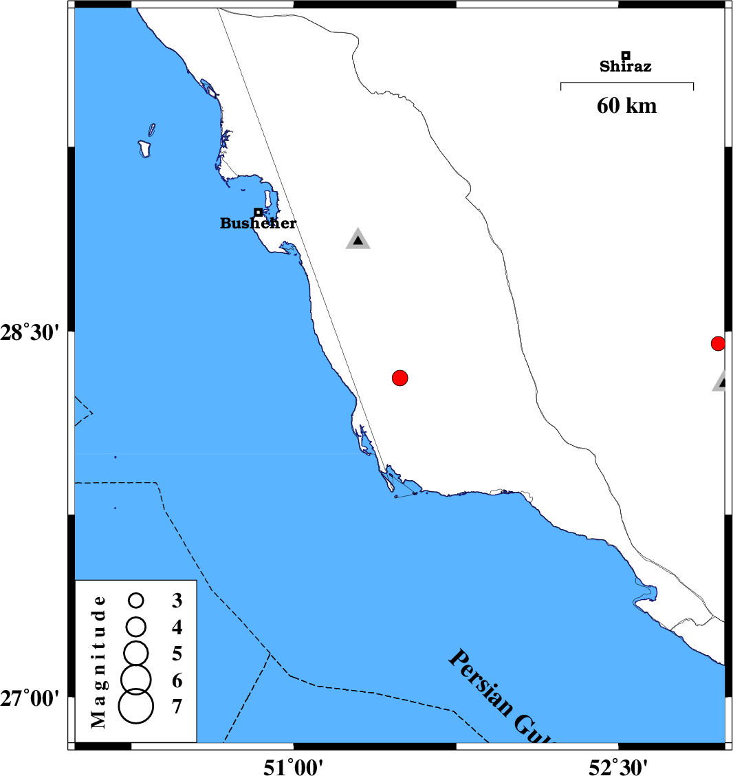 | 2009/11/02 | 19:52:44.8 | 23:22:44.8 | 28.45 | 52.96 | 14 | ML:3 | Fars Province, 7 km Qir va Karzin |