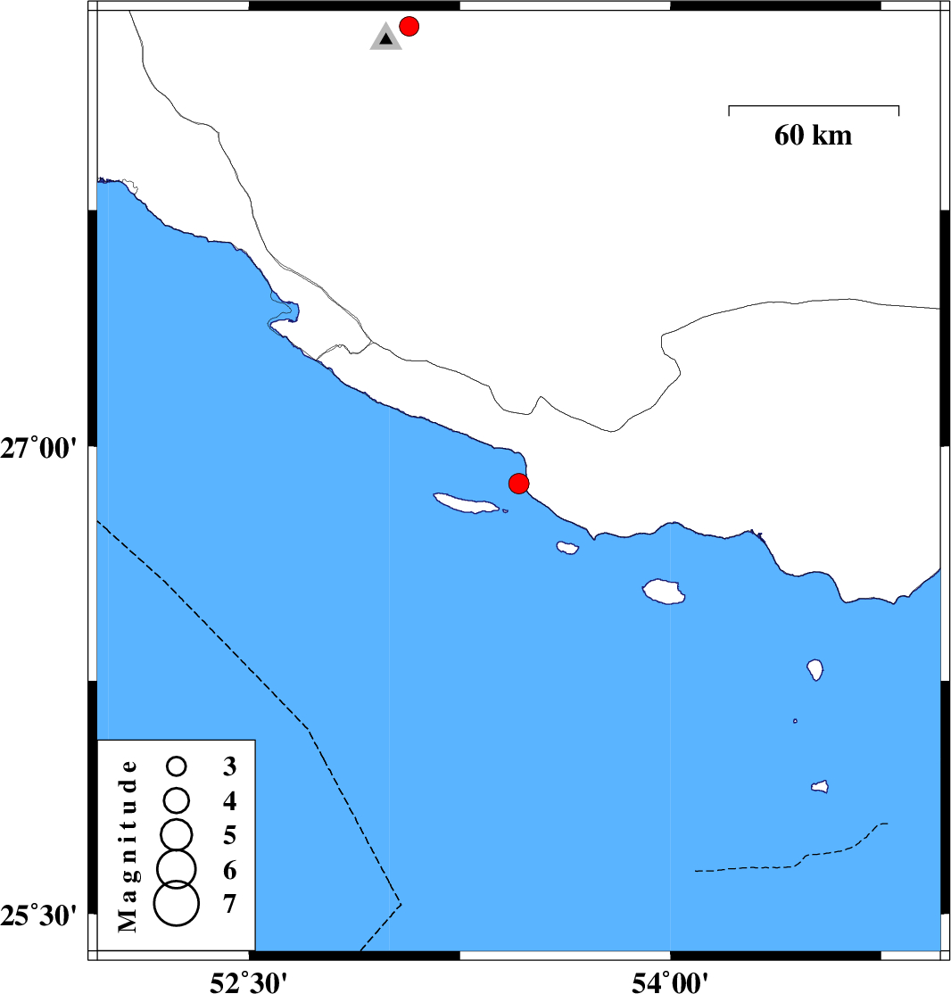 | 2009/11/18 | 06:35:58.4 | 10:05:58.4 | 26.88 | 53.46 | 36 | ML:3.2 | Persian Gulf, 58 km South-East of Lamerd | ||