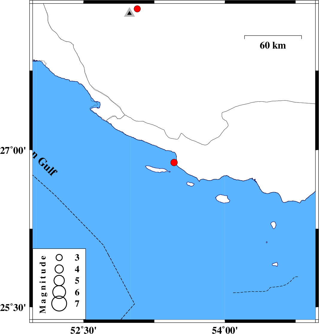| 2009/11/18 | 06:35:58.4 | 10:05:58.4 | 26.88 | 53.46 | 36 | ML:3.2 | Persian Gulf, 58 km South-East of Lamerd | ||