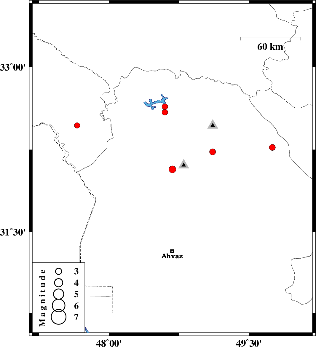 | 2009/11/20 | 09:24:36.4 | 12:54:36.4 | 32.07 | 48.68 | 31 | ML:3.4 | Khoozestan Province, 17 km West of Shushtar | ||
