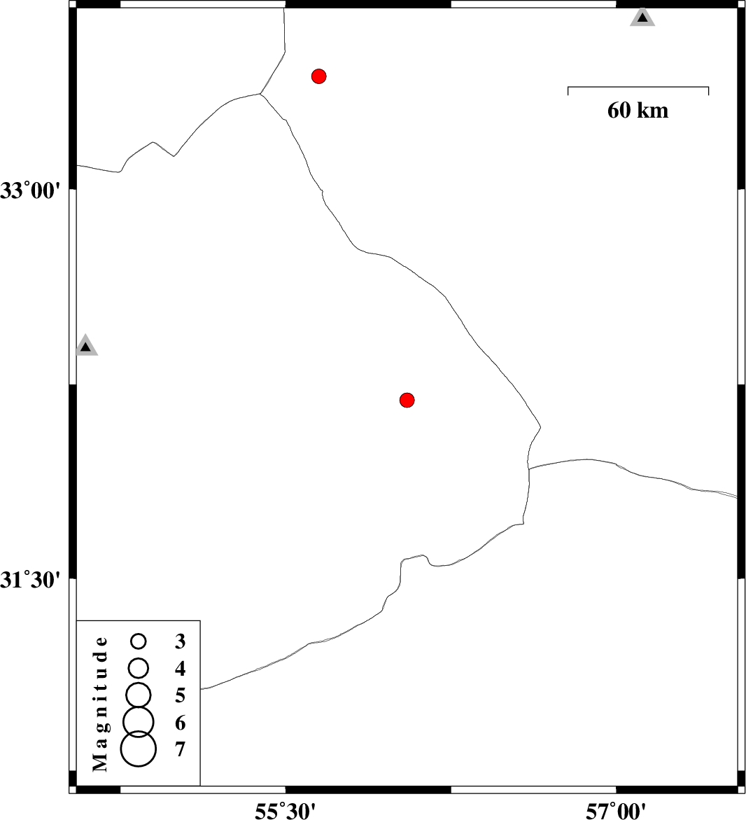 | 2009/11/14 | 07:16:04.3 | 10:46:04.3 | 33.43 | 55.65 | 6 | ML:2.9 | Yazd Province, 120 km South-West of Tabas |