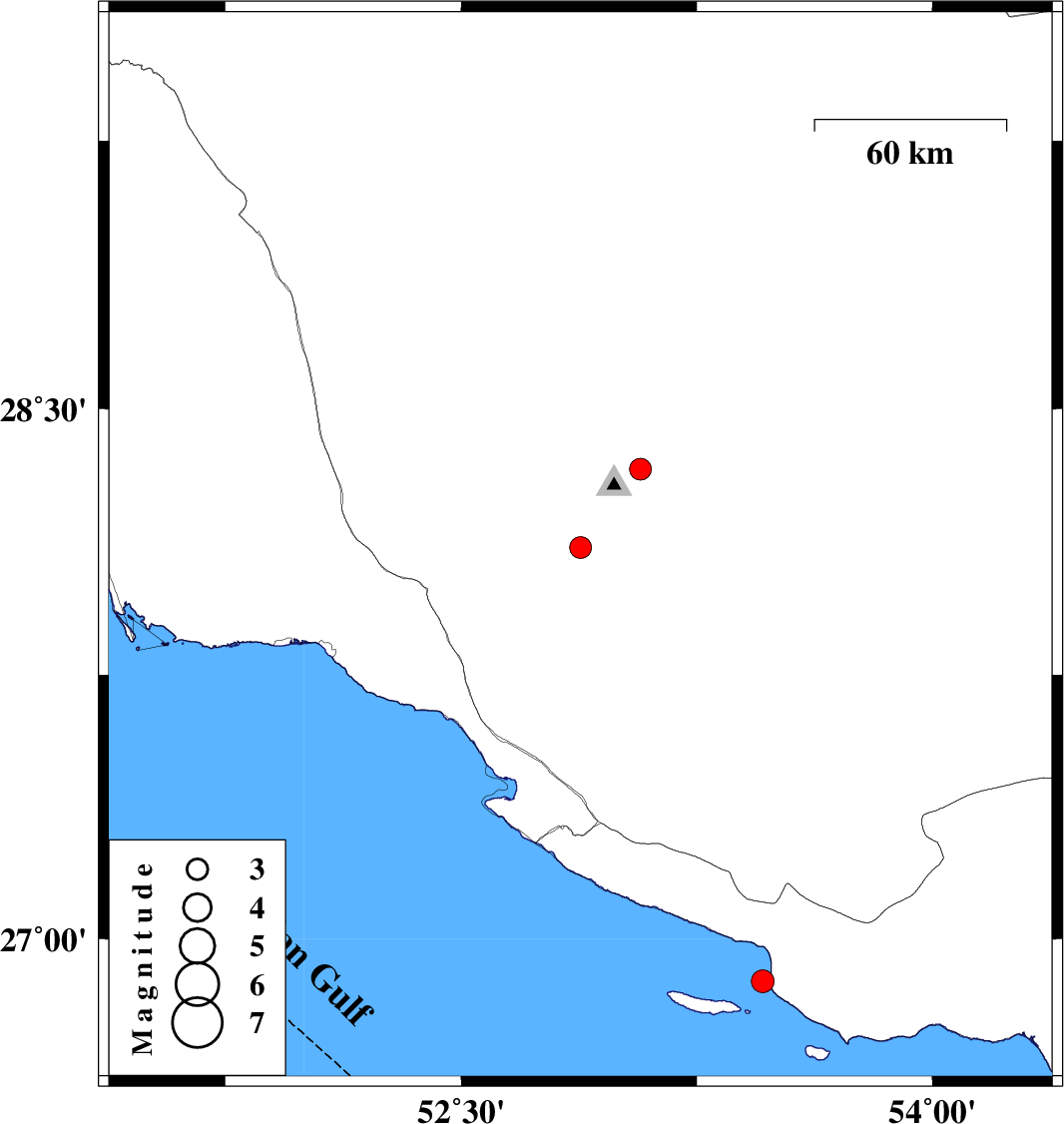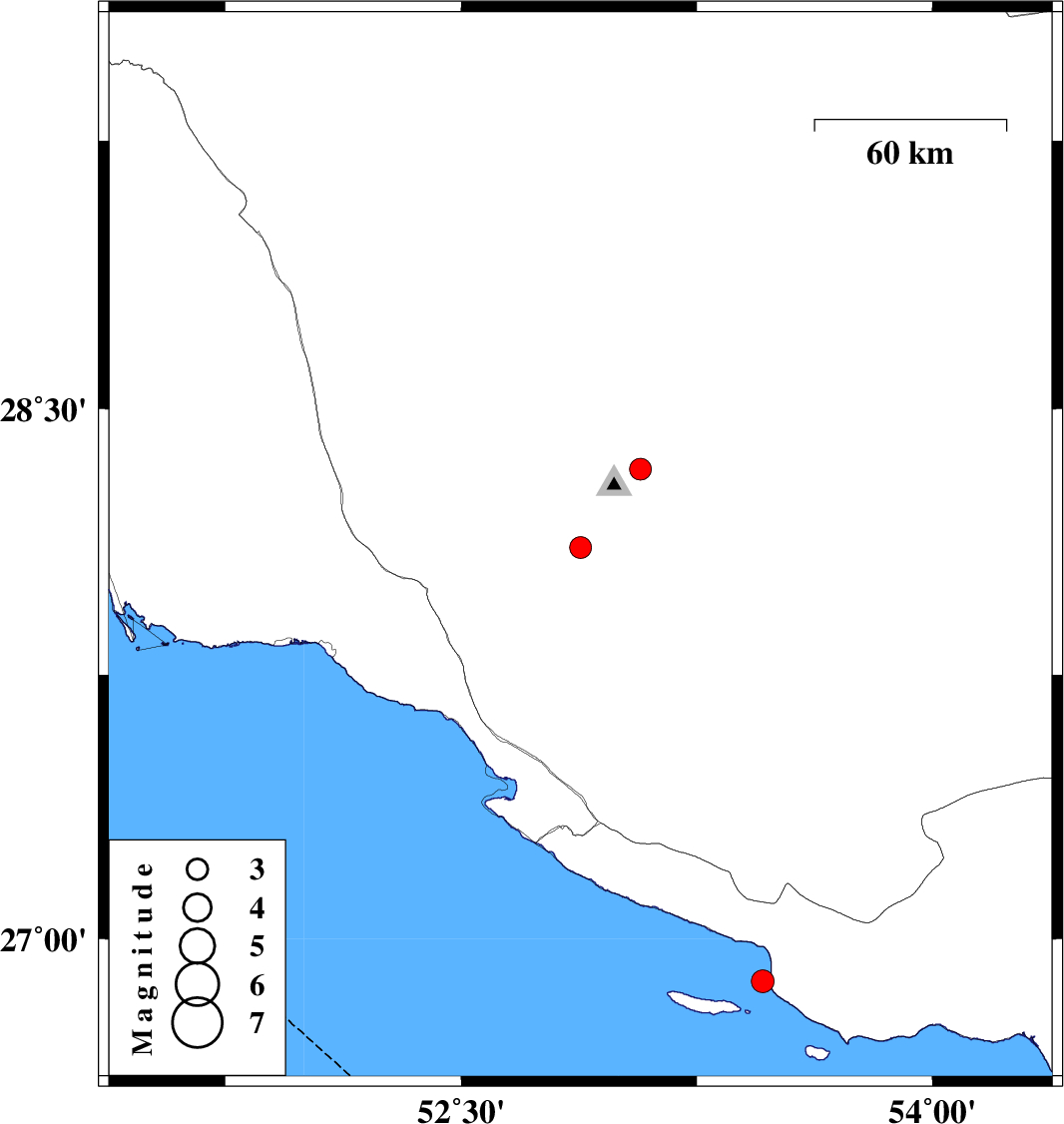 | 2009/11/18 | 06:35:58.4 | 10:05:58.4 | 26.88 | 53.46 | 36 | ML:3.2 | Persian Gulf, 58 km South-East of Lamerd | ||