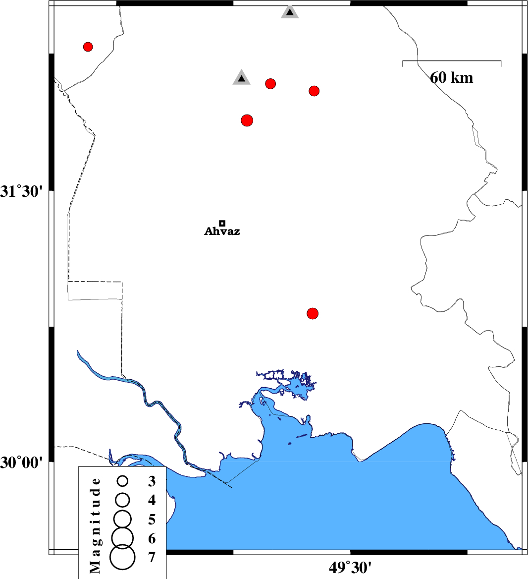 | 2009/11/23 | 03:24:59.5 | 06:54:59.5 | 32.27 | 48.83 | 15 | ML:2.9 | Khoozestan Province, 25 km North of Shushtar | ||