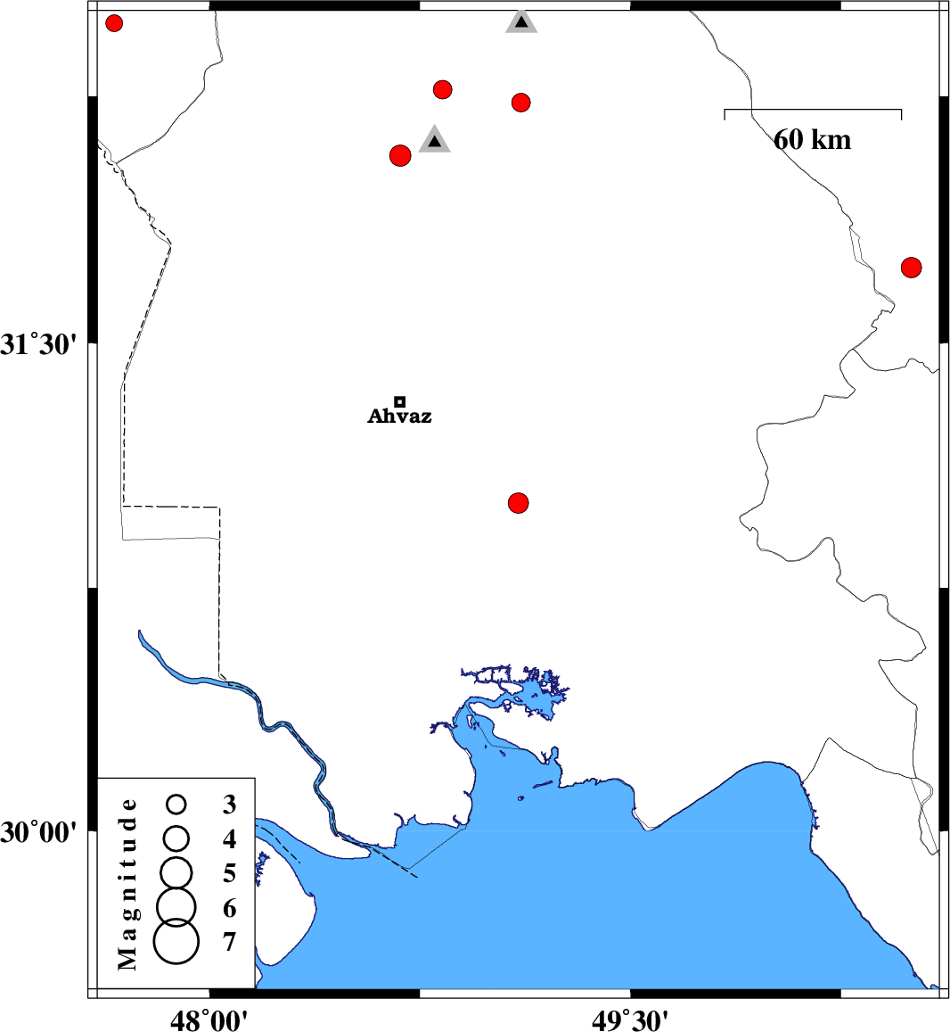 | 2009/11/17 | 12:48:40.1 | 16:18:40.1 | 32.47 | 47.66 | 42 | ML:2.7 | Ilam Province, 45 km South-East of Dehloran | ||