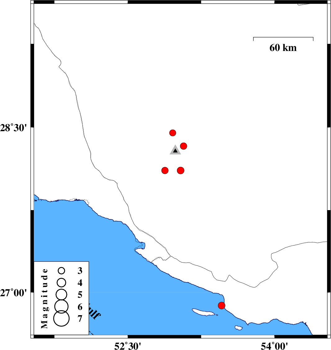 | 2009/11/18 | 06:35:58.4 | 10:05:58.4 | 26.88 | 53.46 | 36 | ML:3.2 | Persian Gulf, 58 km South-East of Lamerd | ||
