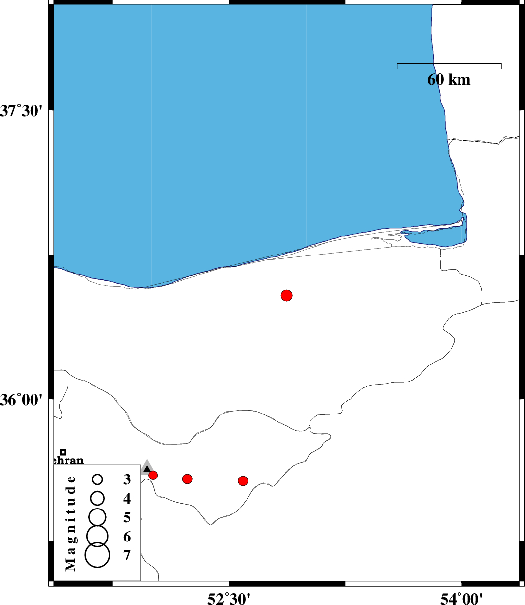| 2009/11/16 | 03:00:09.4 | 06:30:09.4 | 36.54 | 52.87 | 25 | ML:3.2 | Mazandaran Province, 9 km Qaemshahr | ||