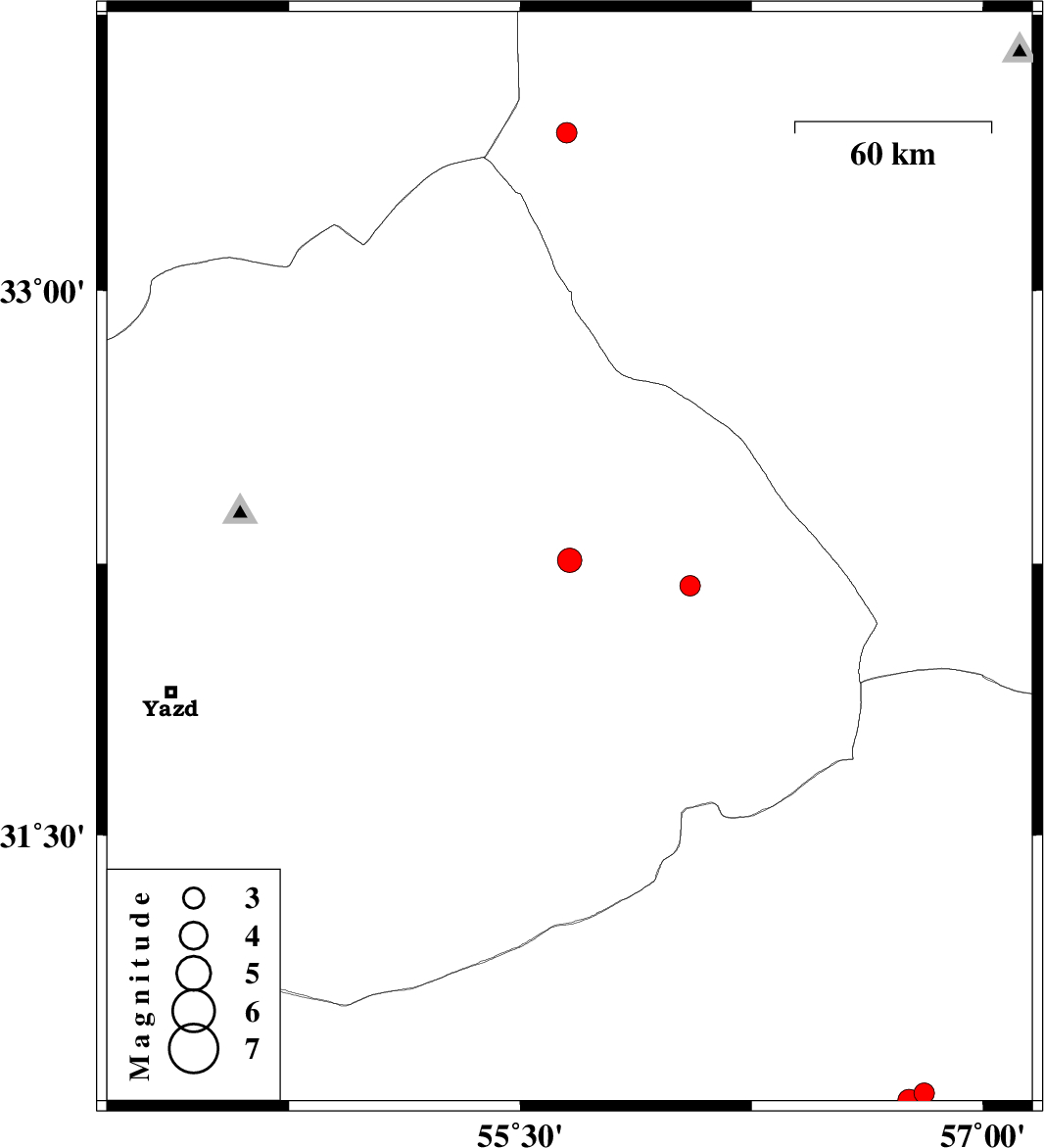 | 2009/11/14 | 07:16:04.3 | 10:46:04.3 | 33.43 | 55.65 | 6 | ML:2.9 | Yazd Province, 120 km South-West of Tabas | ||