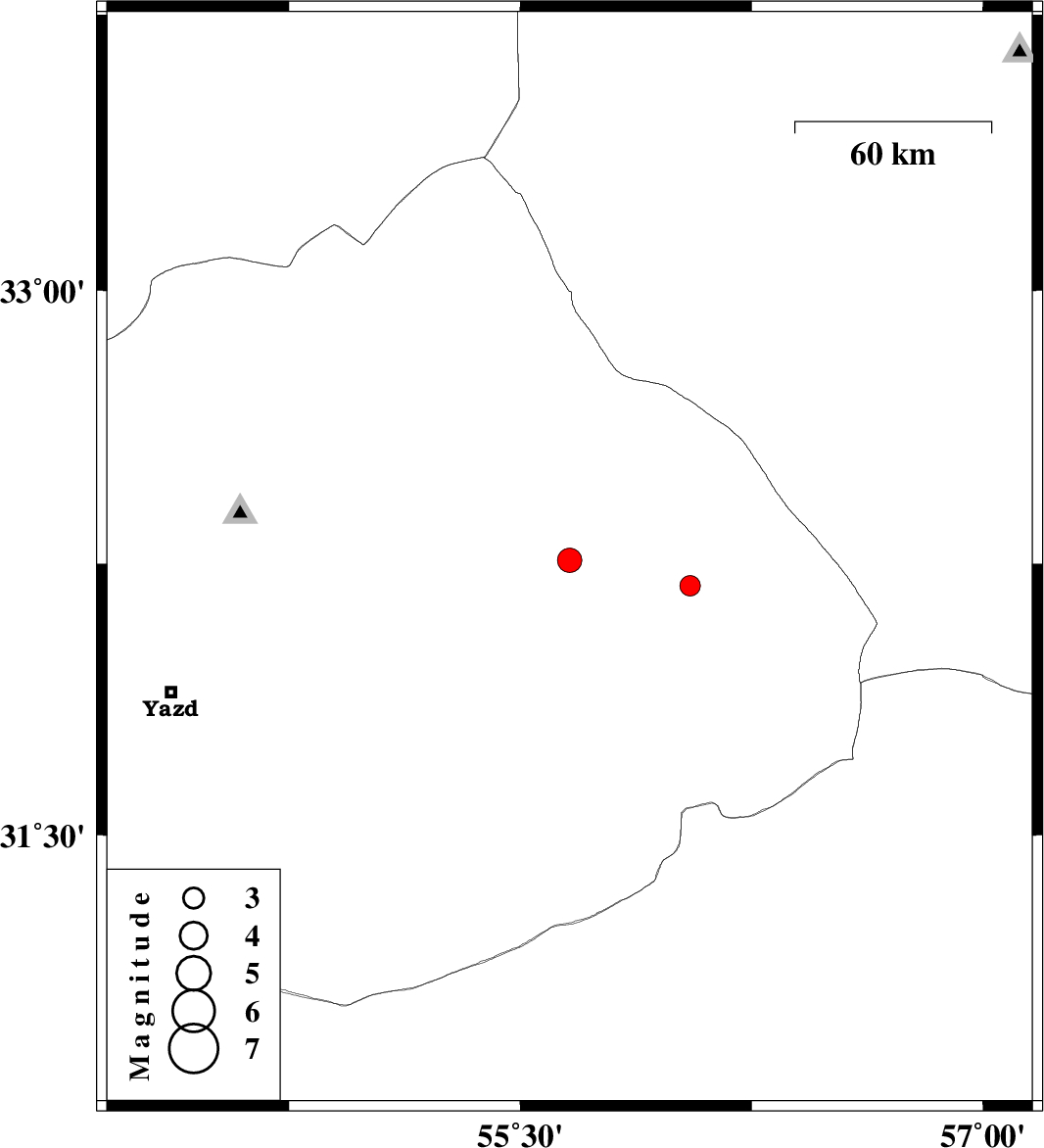 | 2009/11/21 | 19:06:35.4 | 22:36:35.4 | 32.19 | 56.05 | 14 | ML:2.9 | Yazd Province, 90 km North-East of Bafq |