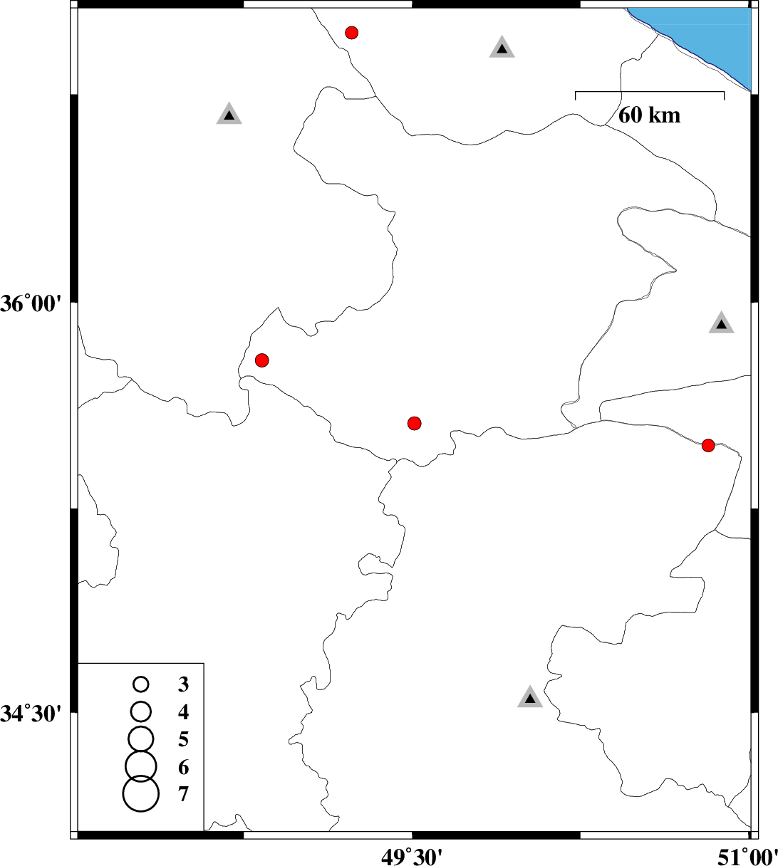 | 2009/11/18 | 00:47:11.3 | 04:17:11.3 | 35.79 | 48.83 | 14 | ML:2.7 | Ghazvin Province, 42 km South-East of Qeydar | ||