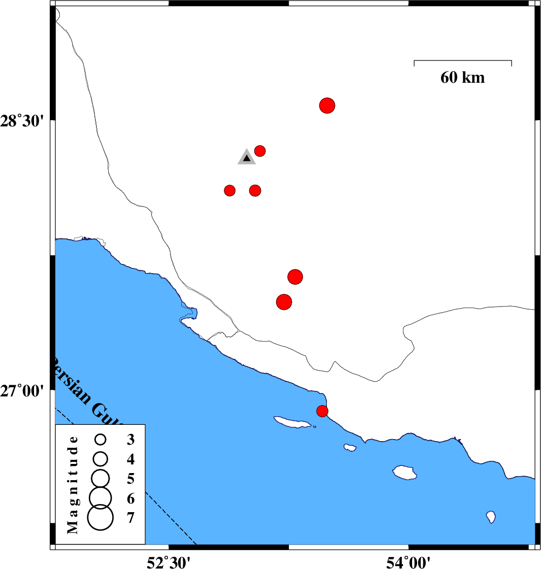 | 2009/11/18 | 06:35:58.4 | 10:05:58.4 | 26.88 | 53.46 | 36 | ML:3.2 | Persian Gulf, 58 km South-East of Lamerd | ||