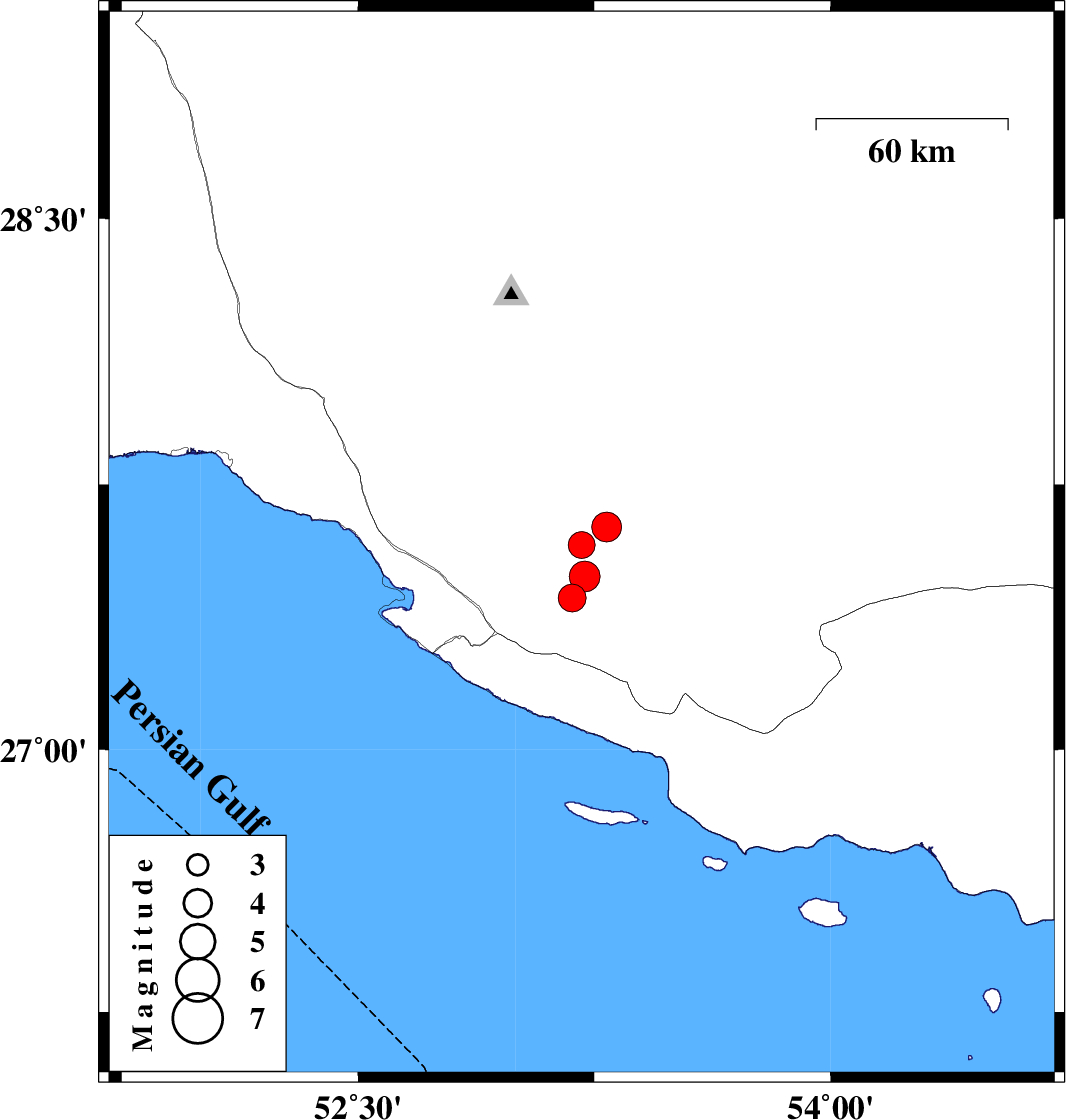 | 2009/12/13 | 03:29:08.1 | 06:59:08.1 | 27.58 | 53.21 | 30 | ML:3.8 | Fars Province, 28 km North of Lamerd | ||