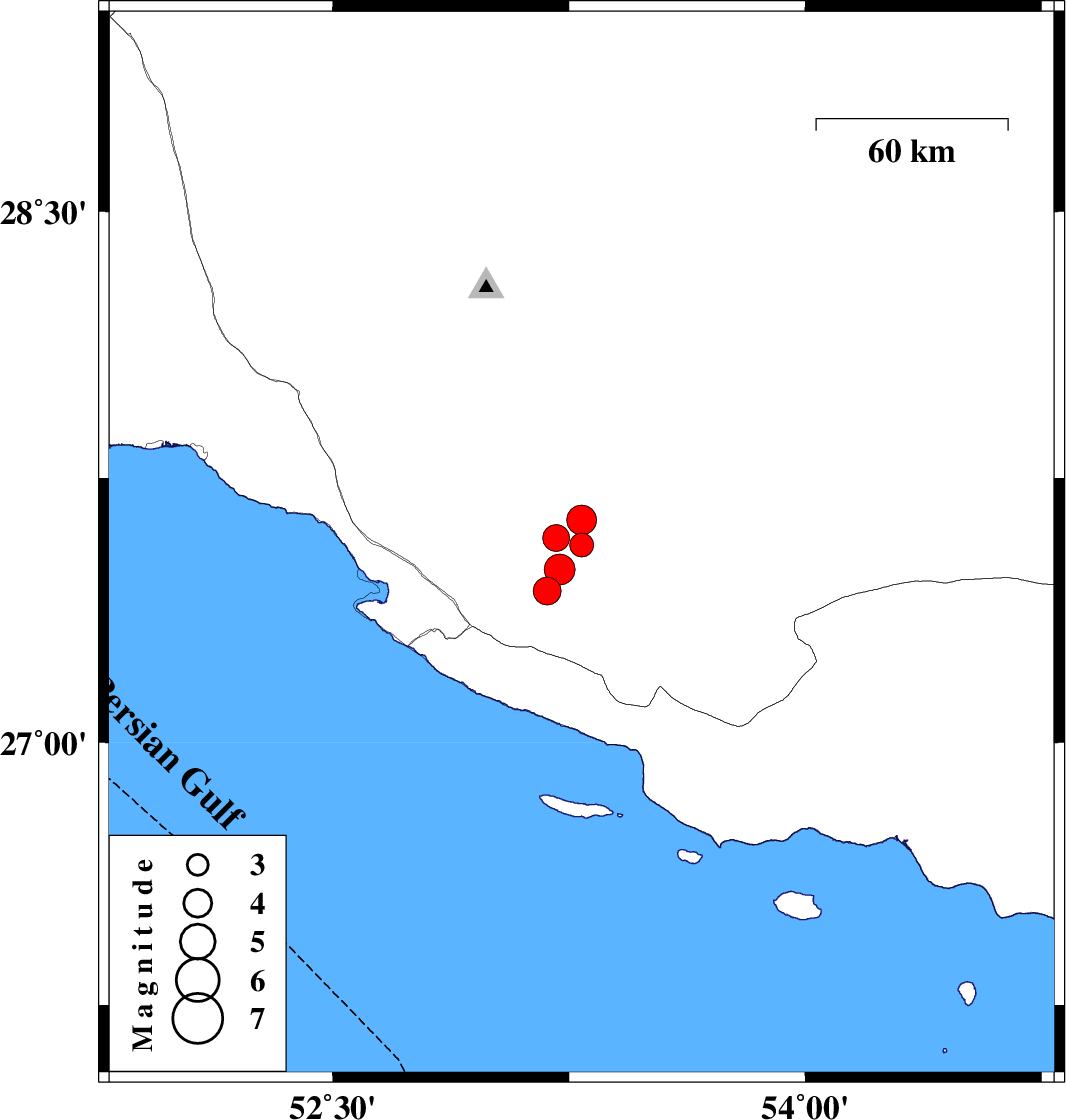 | 2009/12/16 | 09:09:04.5 | 12:39:04.5 | 27.56 | 53.29 | 22 | ML:3.4 | Fars Province, 27 km North-East of Lamerd | ||