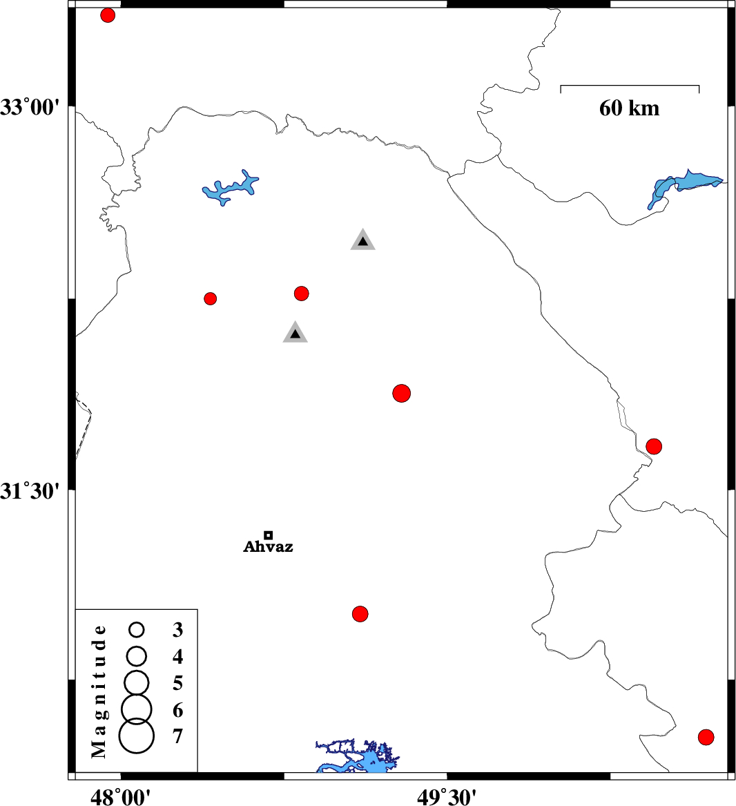 | 2009/11/23 | 03:24:59.5 | 06:54:59.5 | 32.27 | 48.83 | 15 | ML:2.9 | Khoozestan Province, 25 km North of Shushtar |