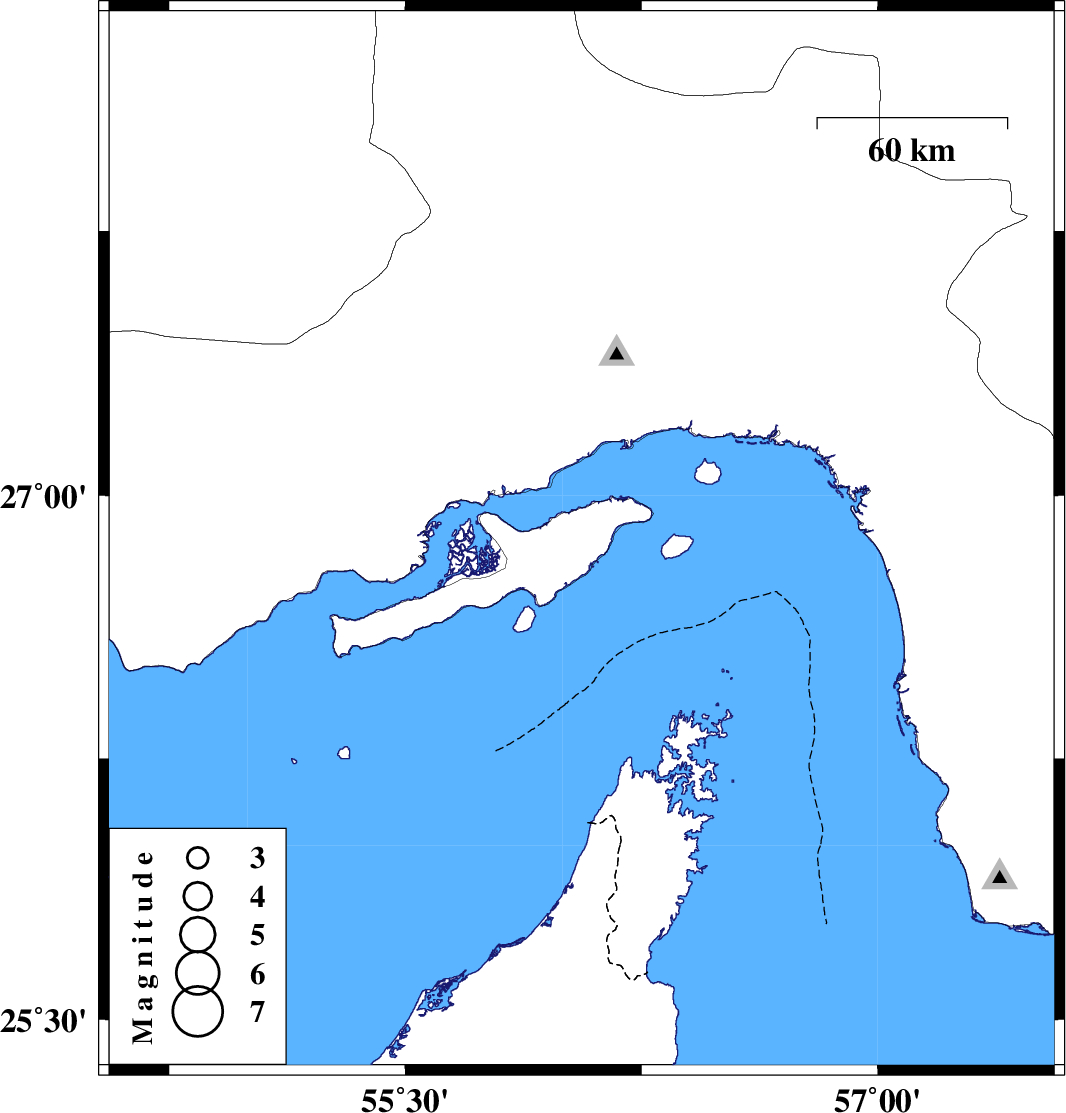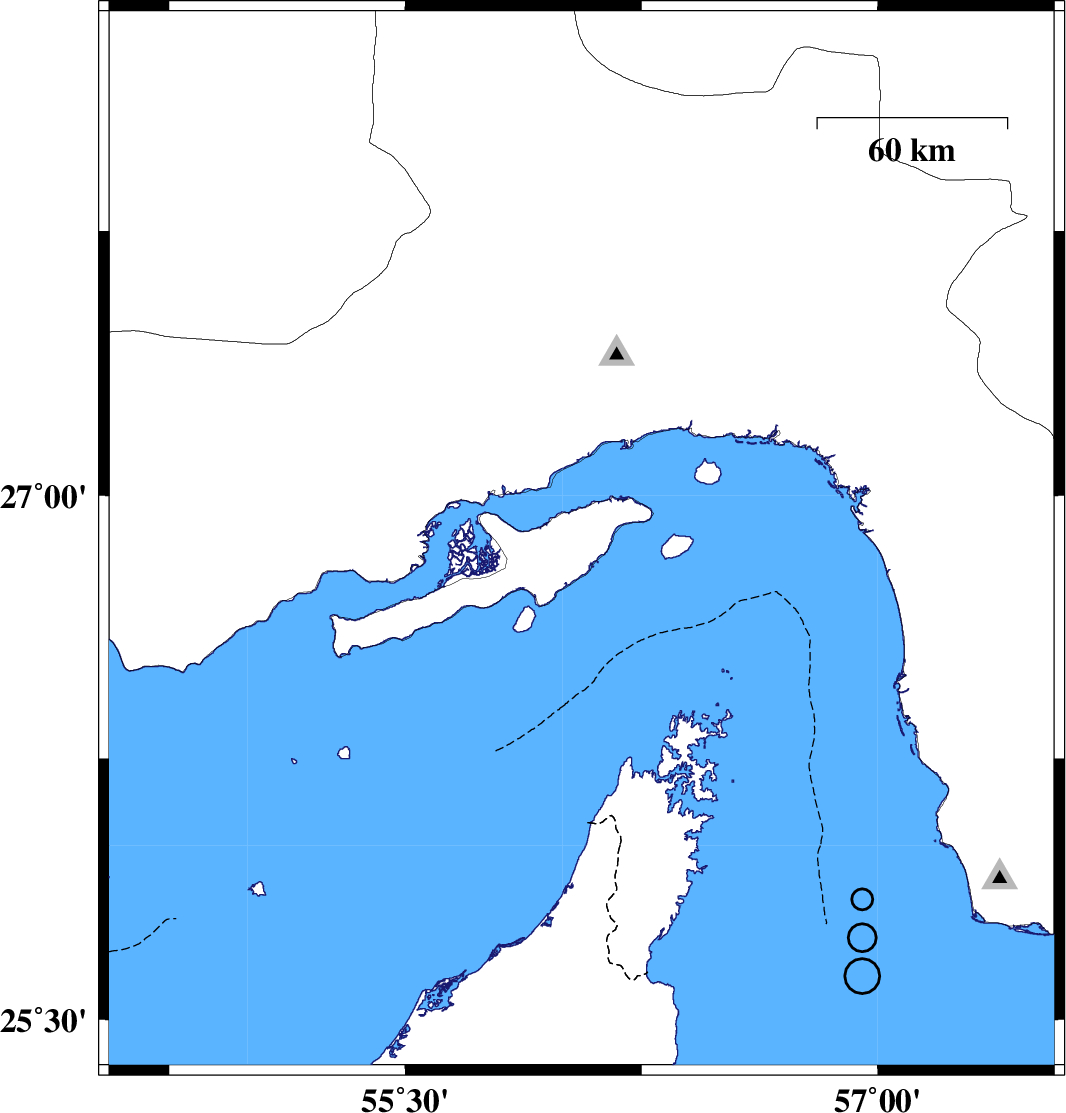 | 2009/12/23 | 16:51:53.2 | 20:21:53.2 | 26.87 | 56.06 | 0 | ML:4.1 | Persian Gulf, 23 km West of Qeshm |