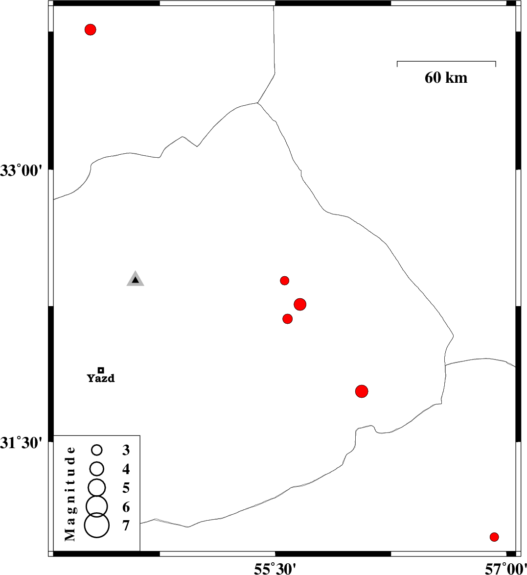 | 2009/11/27 | 06:40:14.1 | 10:10:14.1 | 32.26 | 55.66 | 14 | ML:3.5 | Yazd Province, 78 km North-East of Bafq |