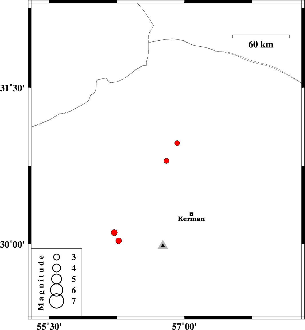 | 2009/12/22 | 07:50:53.7 | 11:20:53.7 | 30.11 | 56.22 | 14 | ML:3.1 | Kerman Province, 40 km South-East of Rafsanjan |