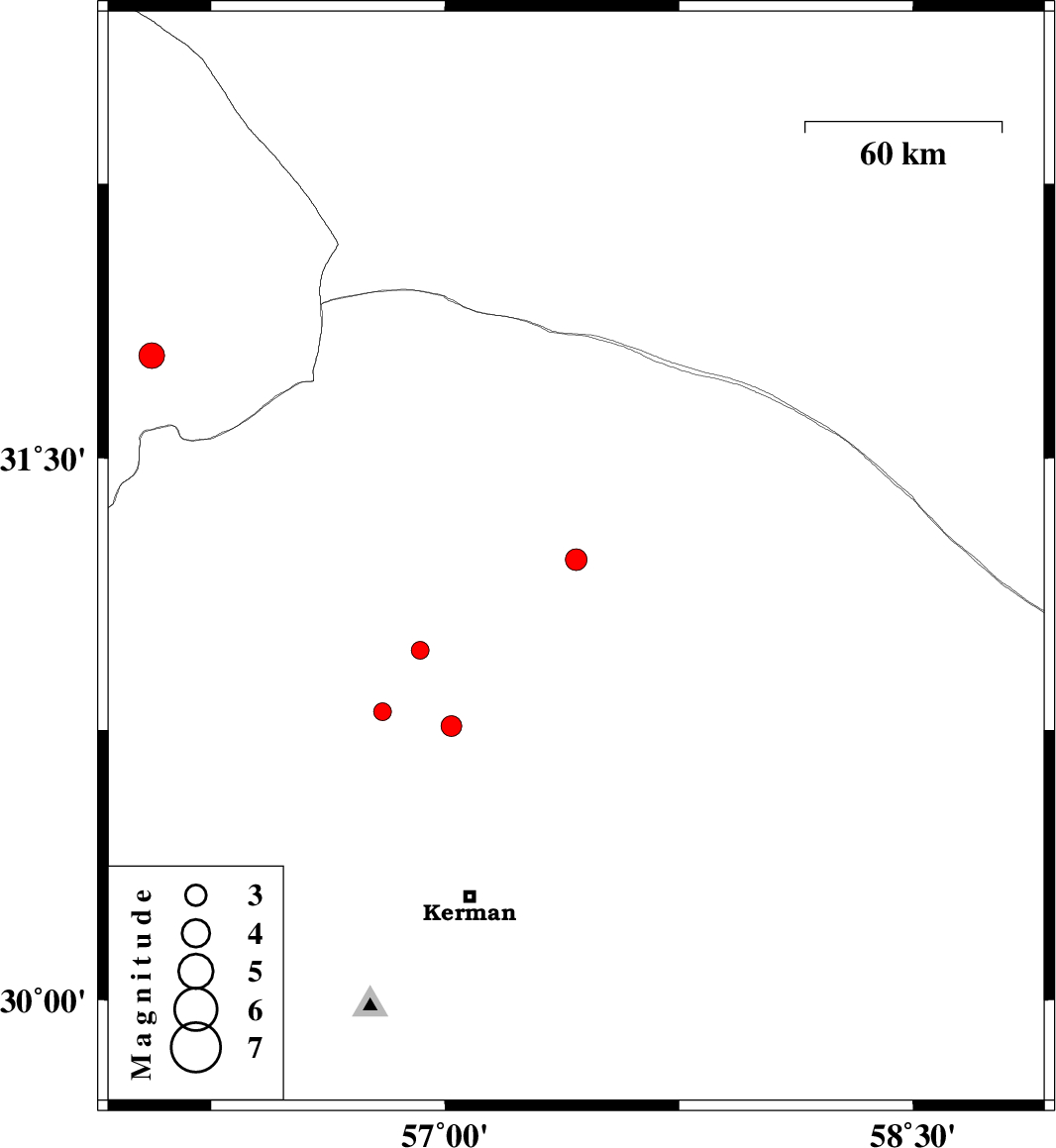 | 2009/12/23 | 01:35:17.7 | 05:05:17.7 | 30.97 | 56.92 | 46 | ML:2.6 | Kerman Province, 34 km South-East of Ravar | ||