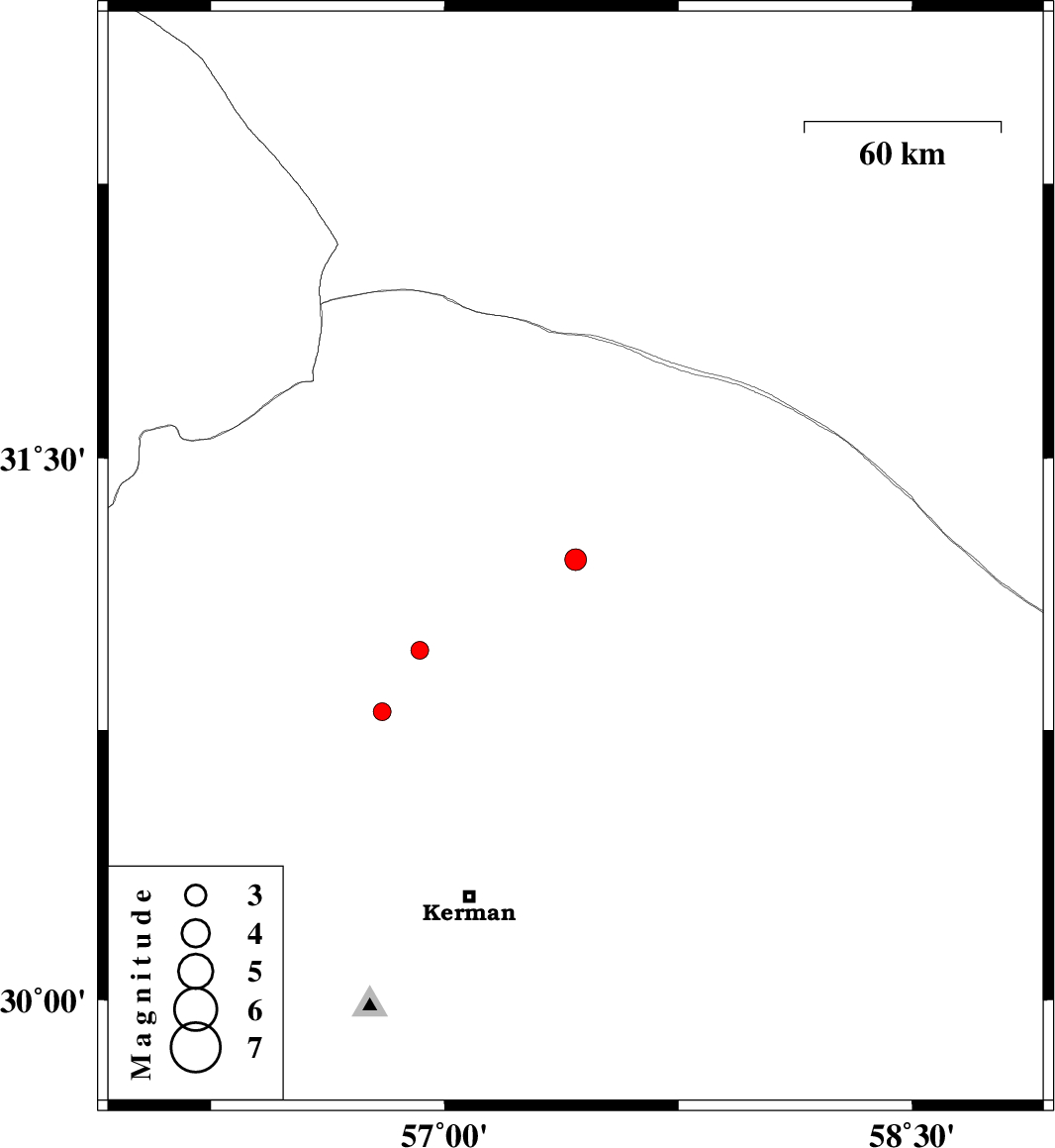 | 2009/12/23 | 01:35:17.7 | 05:05:17.7 | 30.97 | 56.92 | 46 | ML:2.6 | Kerman Province, 34 km South-East of Ravar | ||
