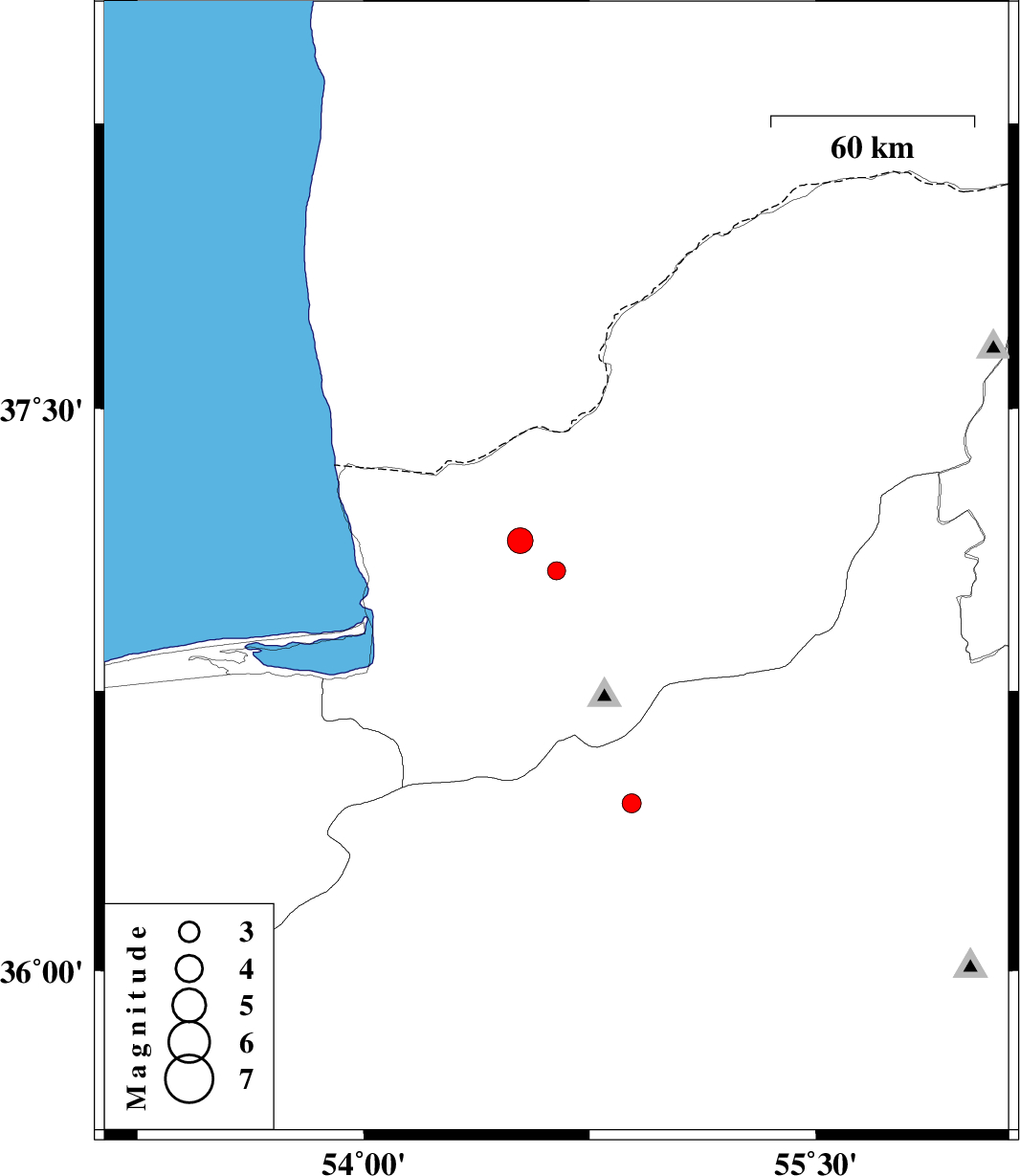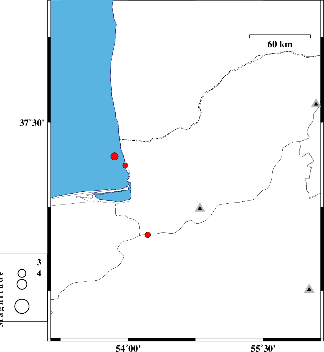 | 2009/12/03 | 20:32:58.4 | 00:02:58.4 | 37.07 | 54.64 | 14 | ML:2.7 | Golestan Province, 17 km East of Aq Qaleh | ||