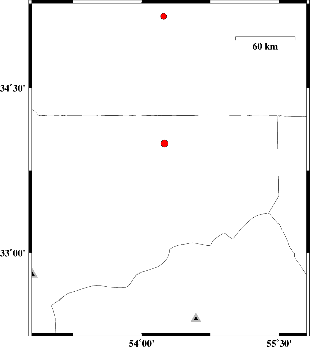 | 2009/11/14 | 07:16:04.3 | 10:46:04.3 | 33.43 | 55.65 | 6 | ML:2.9 | Yazd Province, 120 km South-West of Tabas |