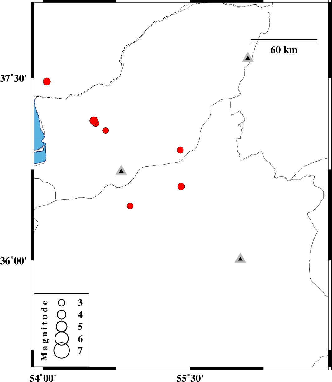 | 2009/11/18 | 17:57:14.2 | 21:27:14.2 | 37.13 | 54.54 | 15 | ML:3 | Golestan Province, 15 km North of Aq Qaleh |