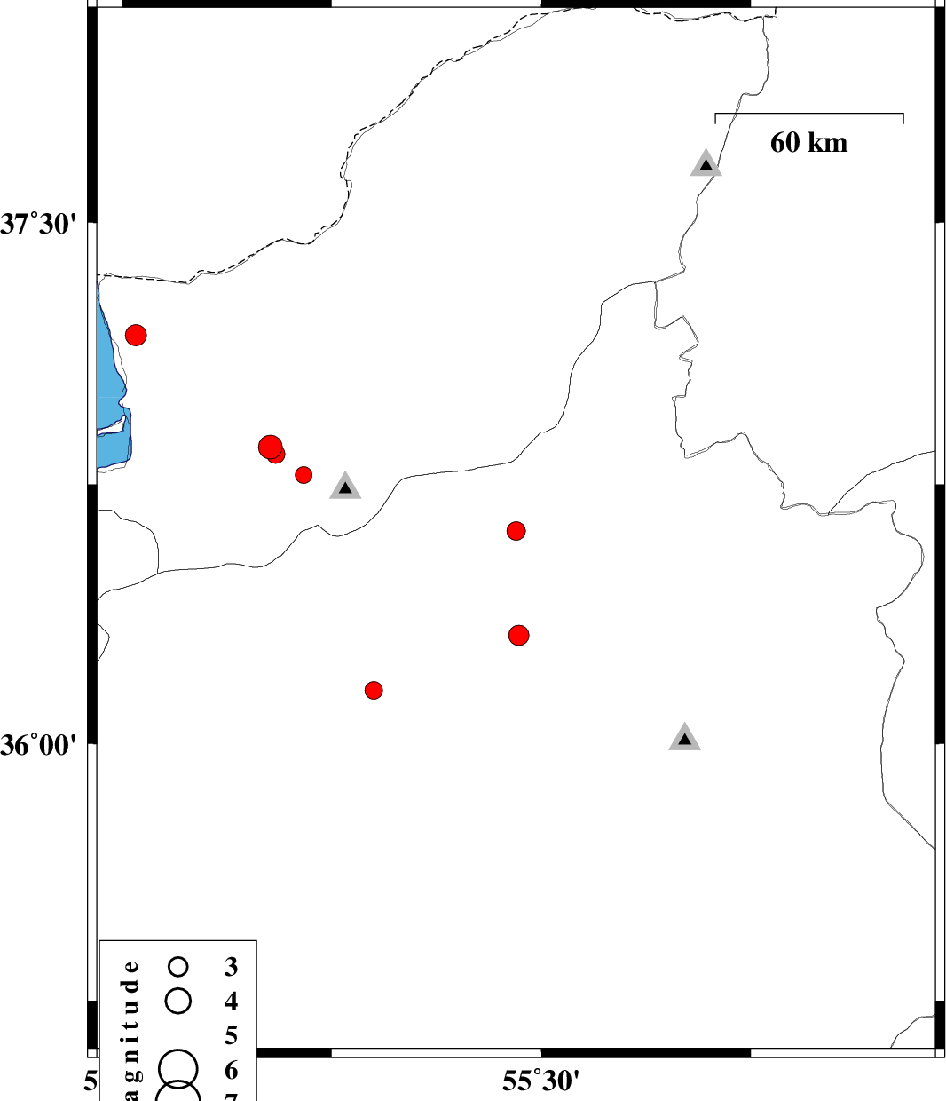 | 2009/12/10 | 14:29:25.0 | 17:59:25.0 | 36.61 | 55.41 | 15 | ML:3.2 | Semnan Province, 45 km North-East of Shahrud | ||