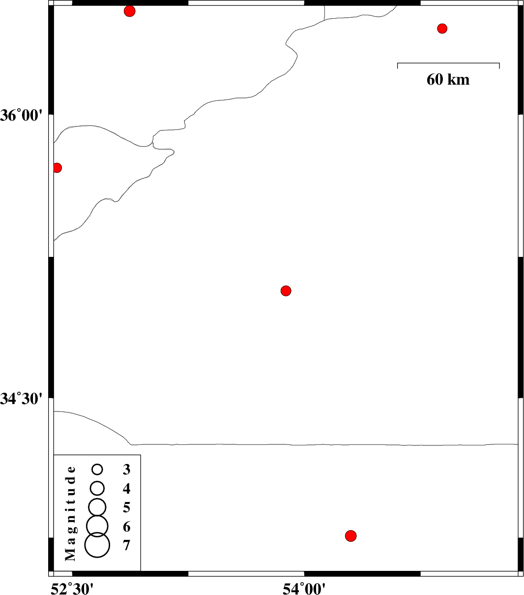 | 2009/12/10 | 15:16:50.4 | 18:46:50.4 | 35.07 | 53.88 | 14 | ML:2.9 | Semnan Province, 70 km South-East of Semnan | ||