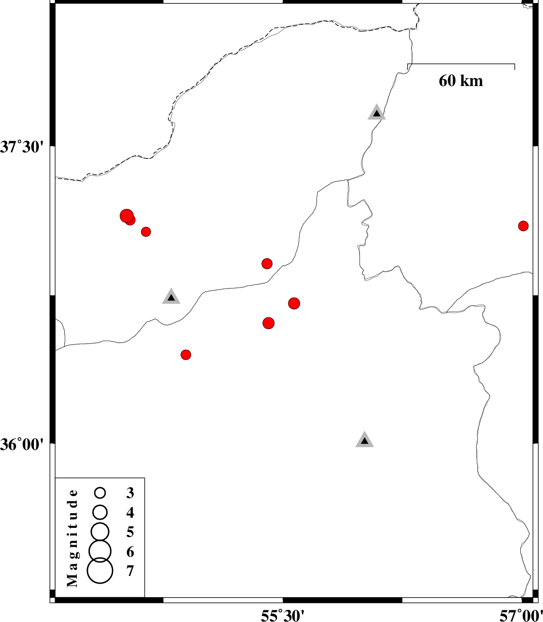 | 2009/11/18 | 17:57:14.2 | 21:27:14.2 | 37.13 | 54.54 | 15 | ML:3 | Golestan Province, 15 km North of Aq Qaleh |