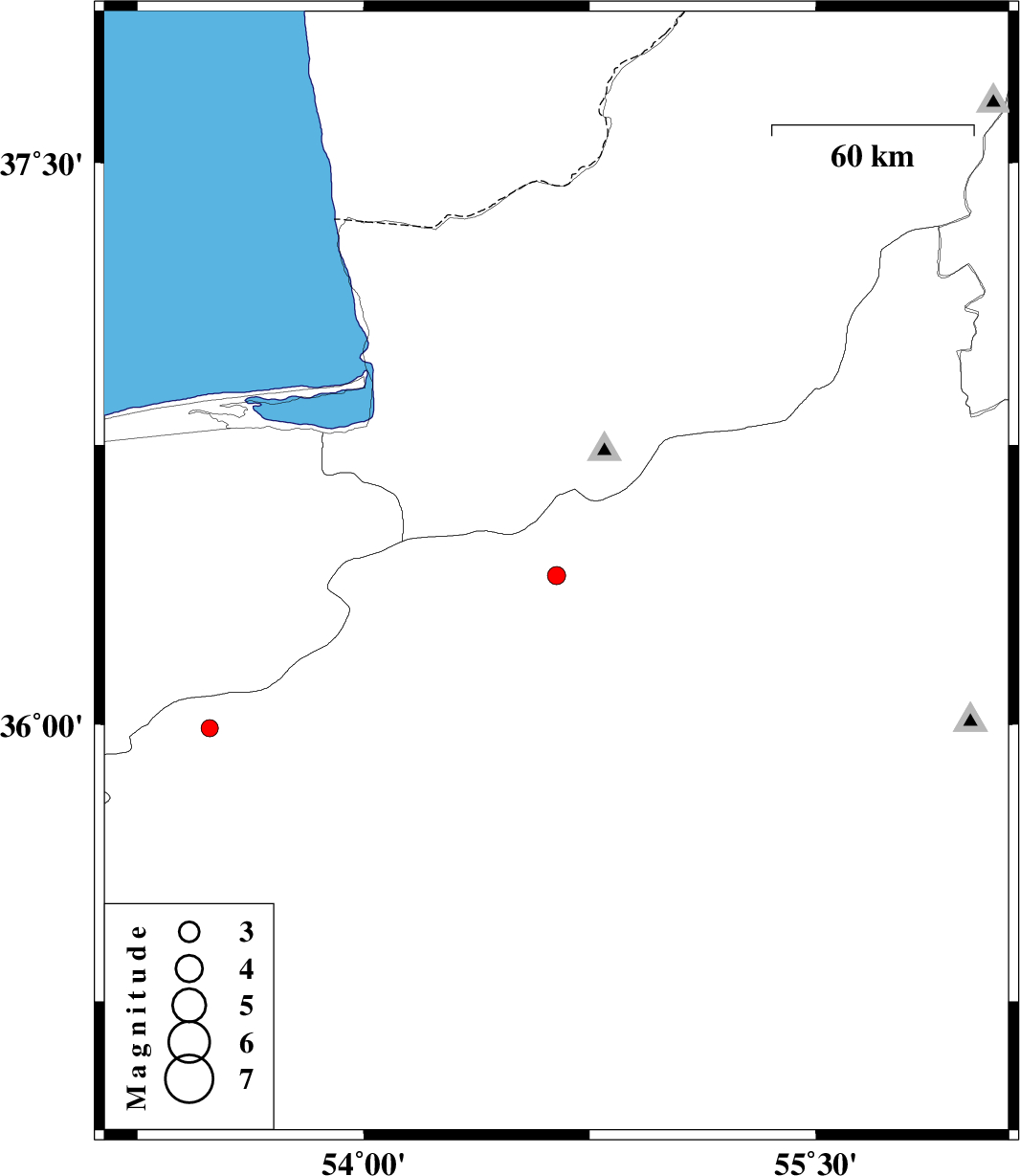 | 2009/12/30 | 15:38:46.8 | 19:08:46.8 | 36.4 | 54.64 | 14 | ML:2.7 | Semnan Province, 30 km West of Shahrud | ||