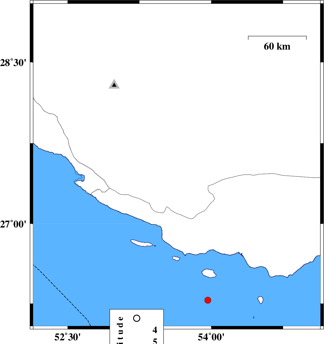 2010/04/01 | 07:31:59.8 | 12:01:59.8 | 27.46 | 53.6 | 40 | ML:3.9 | Fars Province, 45 km North-East of Lamerd | ||