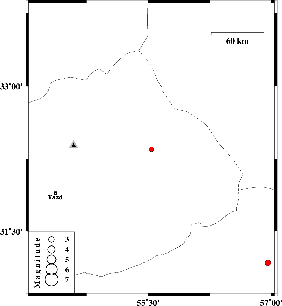 | 2010/04/11 | 00:50:08.8 | 05:20:08.8 | 31.17 | 56.96 | 25 | ML:3.1 | Kerman Province, 17 km East of Ravar |