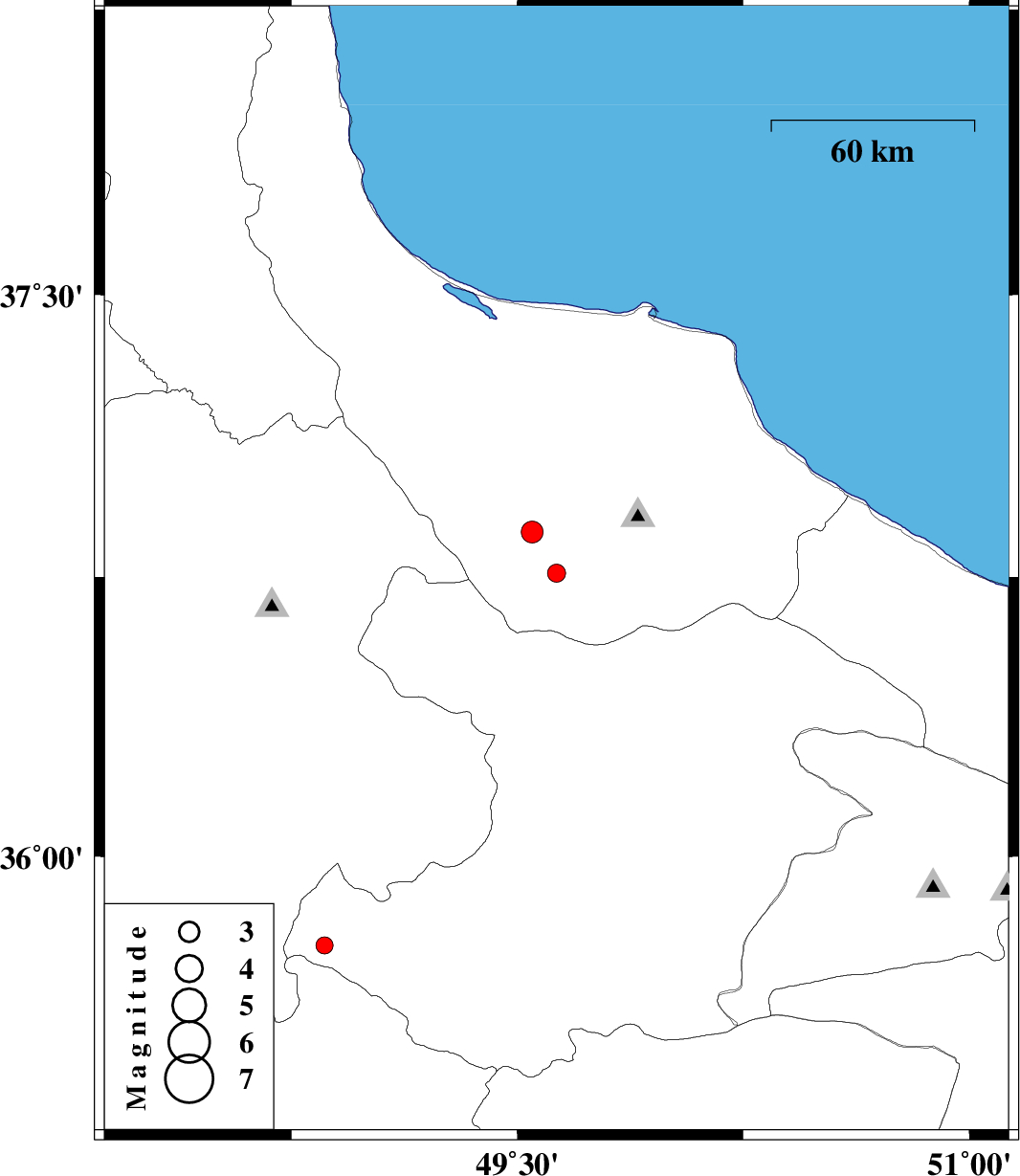 | 2010/04/17 | 06:20:05.1 | 10:50:05.1 | 36.87 | 49.55 | 15 | ML:3.2 | Gilan Province, 12 km East of Rudbar |