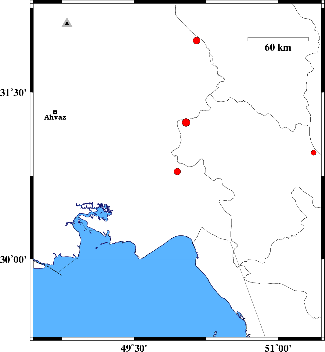| 2010/04/20 | 11:39:43.2 | 16:09:43.2 | 30.79 | 49.95 | 14 | ML:3.1 | Khoozestan Province, 24 km East of Omidiyeh | ||