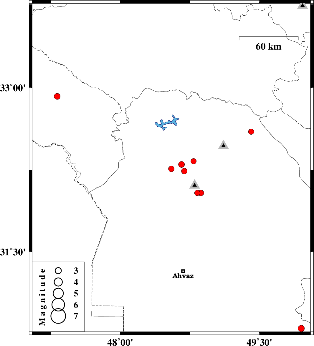 | 2010/04/20 | 11:39:43.2 | 16:09:43.2 | 30.79 | 49.95 | 14 | ML:3.1 | Khoozestan Province, 24 km East of Omidiyeh | ||