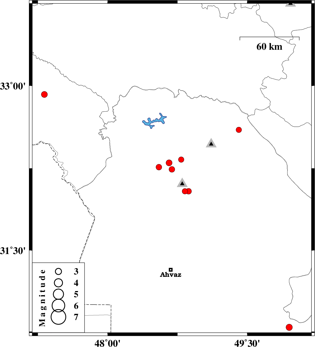 | 2010/04/20 | 11:39:43.2 | 16:09:43.2 | 30.79 | 49.95 | 14 | ML:3.1 | Khoozestan Province, 24 km East of Omidiyeh | ||