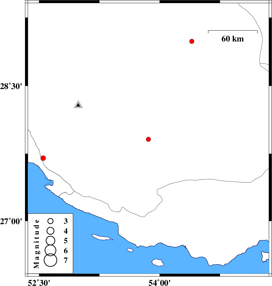 | 2010/04/24 | 04:45:45.3 | 09:15:45.3 | 27.7 | 52.55 | 6 | ML:2.8 | Fars Province, 27 km South-East of Jam | ||
